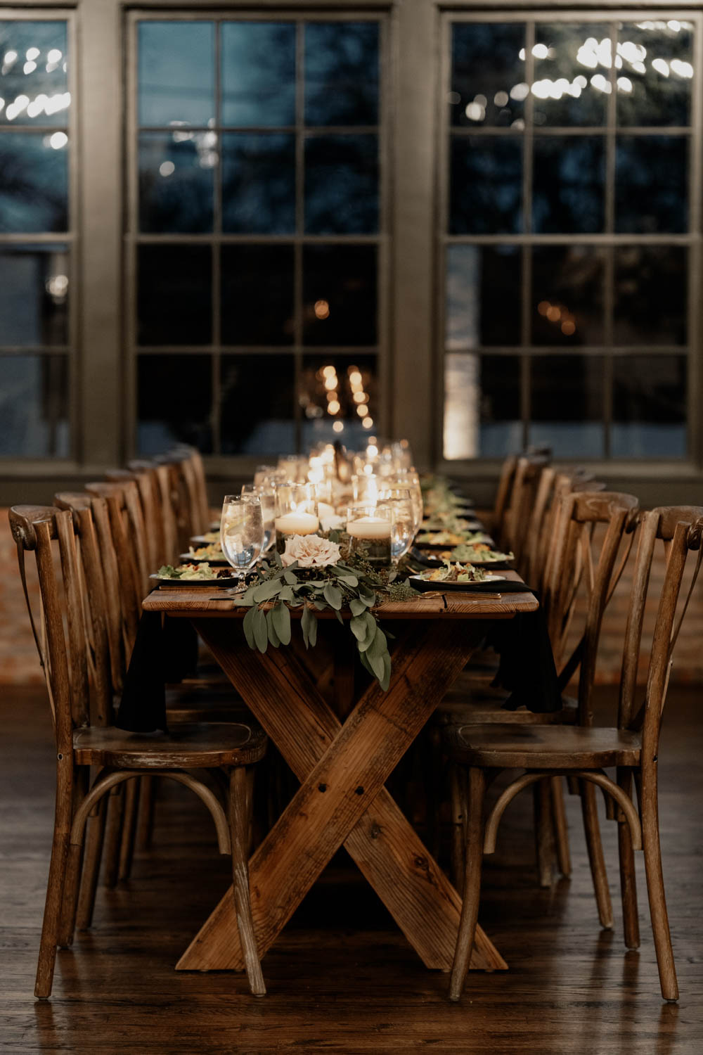 The two front rooms were the original two classrooms built in 1911. These rooms have a mixture of exposed brick and dark raised panel walls that blend beautifully together. The divided light windows and transoms allow for natural light to stream through, but at night the crystal chandeliers and sconces throughout add a timeless beauty and elegance to the room. The space is equipped with two frame TVs that can showcase a slideshow or artwork. Either one or both of the meeting rooms can be rented for private events.