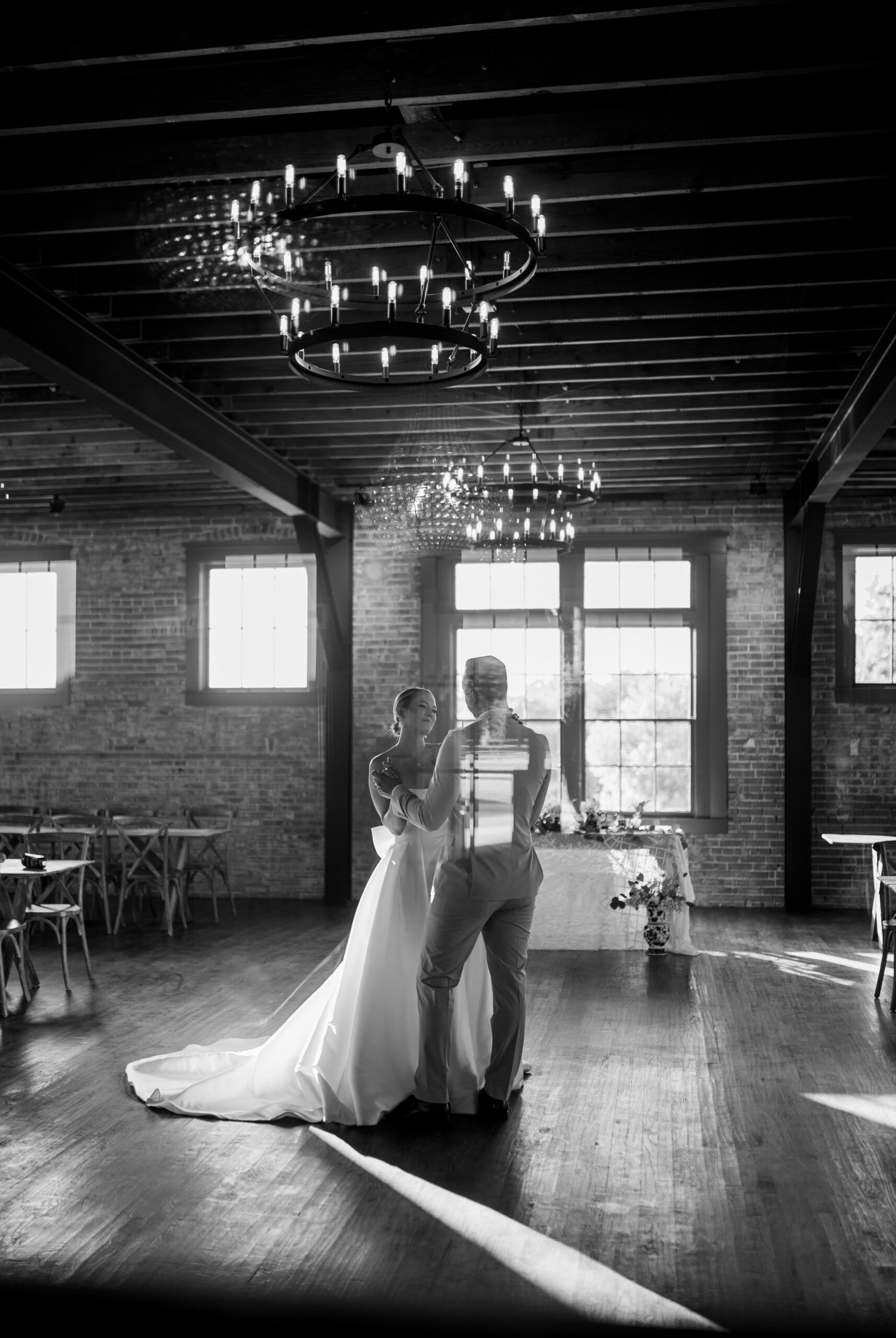 The Reception Room originally housed two more classrooms that were built in 1917. This room showcases the original brick walls, stained hardwood floors, open ceiling structure, and 6 two-tier iron chandeliers with dimming capabilities. Large iron beams span the entire room and highlight the beautiful sliding doors at the entry of the space. The original divided light windows and transoms offer an abundance of natural light and the arched doors are a beautiful feature for the room.