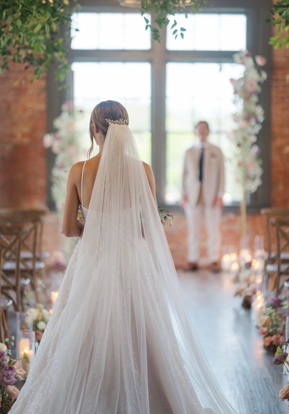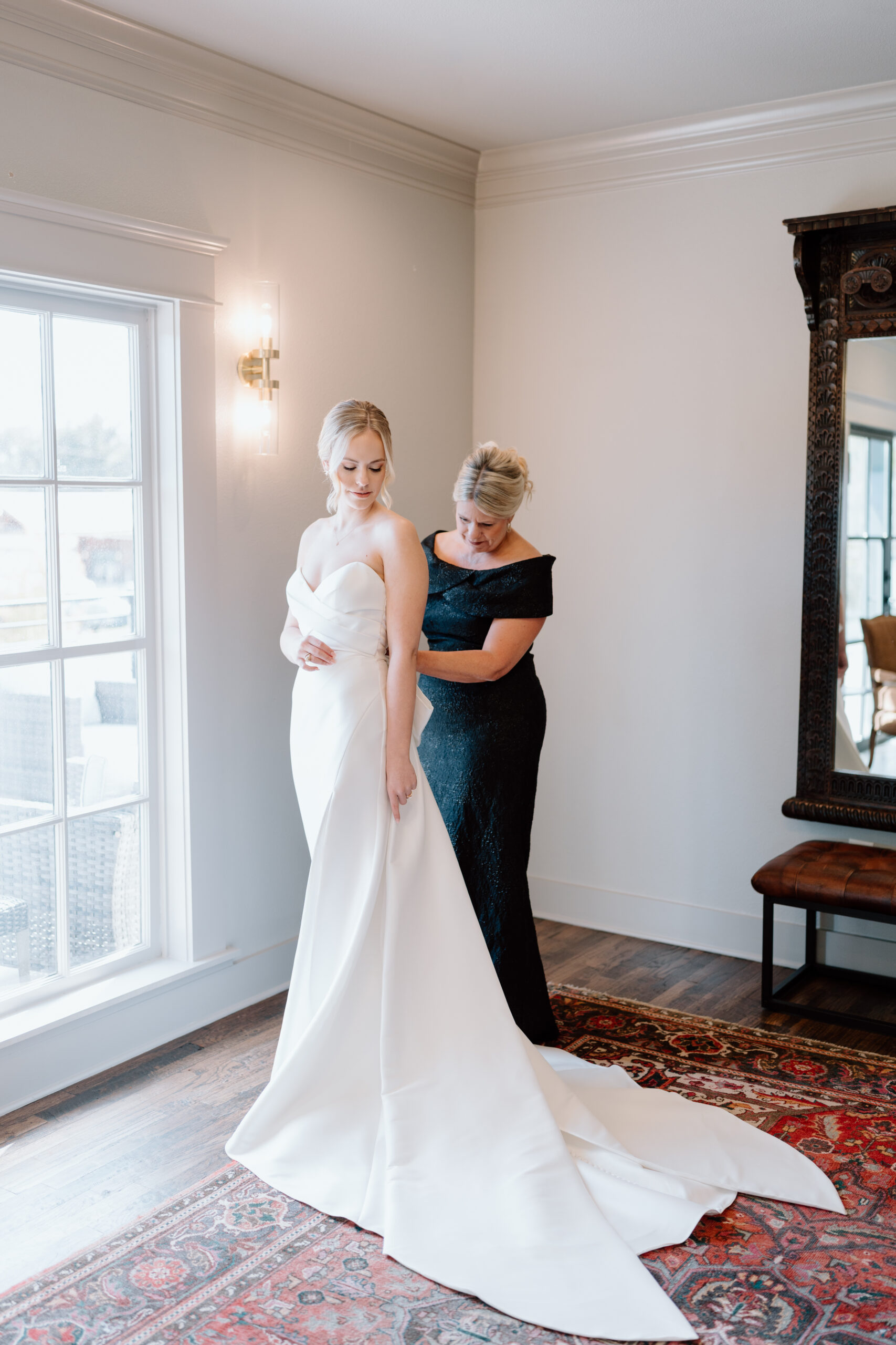 The Bridal Suite hosts a spacious lounge area with tufted leather sofas, an antique farm table with seating for 8, two smart TVs, large gilded antique mirrors, and a bar area. The natural light beaming in from the upstairs balcony and the beautiful overhead view of the courtyard makes it the picture-perfect getting ready location . The space also has two bathrooms, one having a large full-body mirror and bench that is perfect for dressing. There is also a private closet with keypad access to store personal belongings during events.
